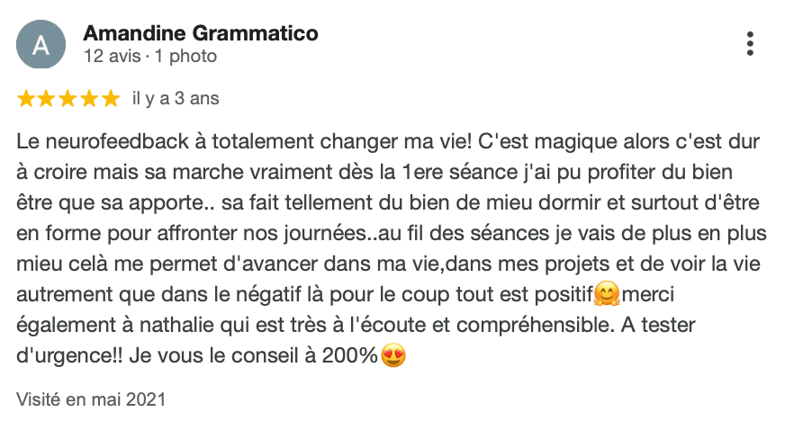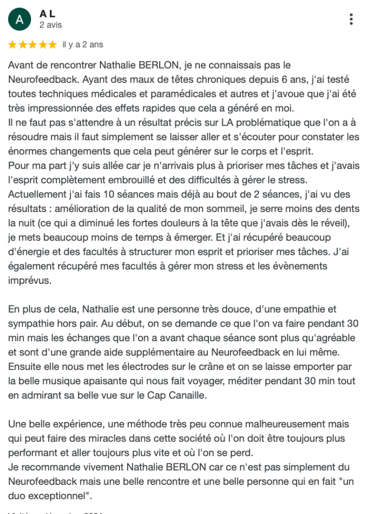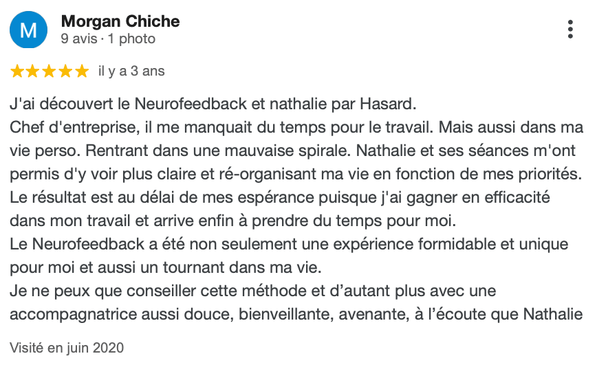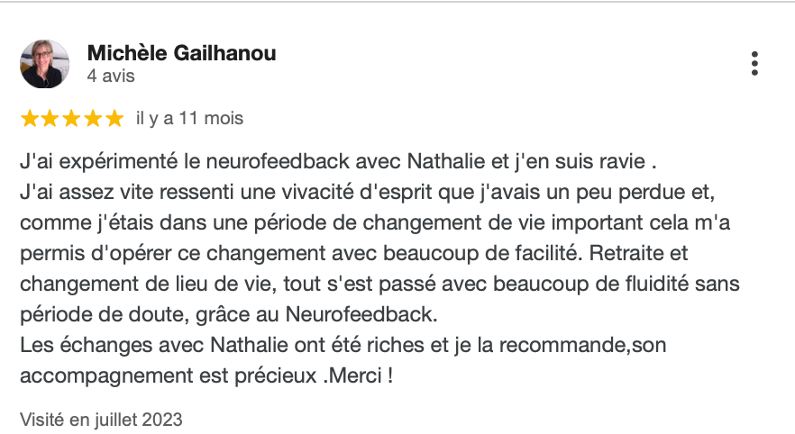 Le Neurofeedback a nettement amélioré la qualité de mon sommeil. J’étais insomniaque depuis l’adolescence et je suis toujours sujette aux insomnies dans les périodes difficiles. Le reste du temps, je sais que lorsque je vais me coucher, je vais dormir, ce qui n’était plus le cas depuis très longtemps.