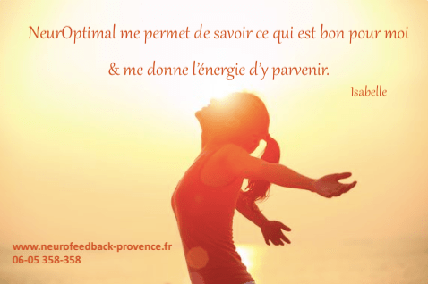 J’ai coutume de dire : « Plus vous avez d’attentes précises, plus vous risquez de ressentir de frustration. Le neurofeedback procure un état de bien-être général inégalé, mais ne « soigne » rien. » Ce qui n’est pas toujours la réponse attendue… J’ajoute que le neurofeedabck permet de prendre beaucoup de recul & de se détacher du symptome devenu parfois obsédant. Ce qui change la vie !