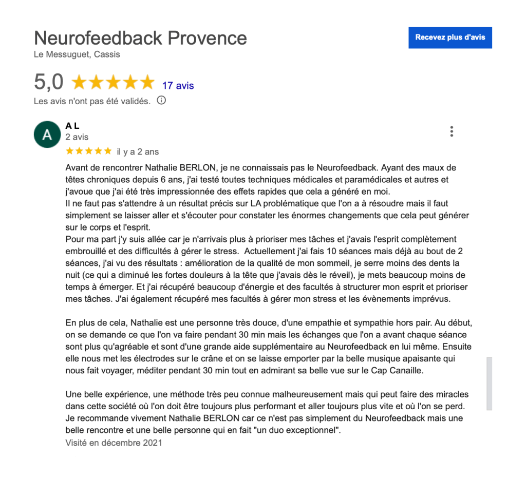 N’hésitez pas à vous abonner à ma page Facebook mise à jour régulièrement. Vous y trouverez informations, témoignages, articles, liens, vidéos, … @NeurofeedbackProvence. Et prenez le temps de lire les témoignages sur google.